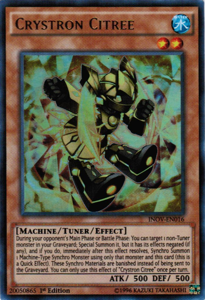 During your opponent's Main Phase or Battle Phase: You can target 1 non-Tuner monster in your Graveyard; Special Summon it, but it has its effects negated (if any), and if you do, immediately after this effect resolves, Synchro Summon 1 Machine-Type Synchro Monster using only that monster and this card (this is a Quick Effect). These Synchro Materials are banished instead of being sent to the Graveyard. You can only use this effect of "Crystron Citree" once per turn.