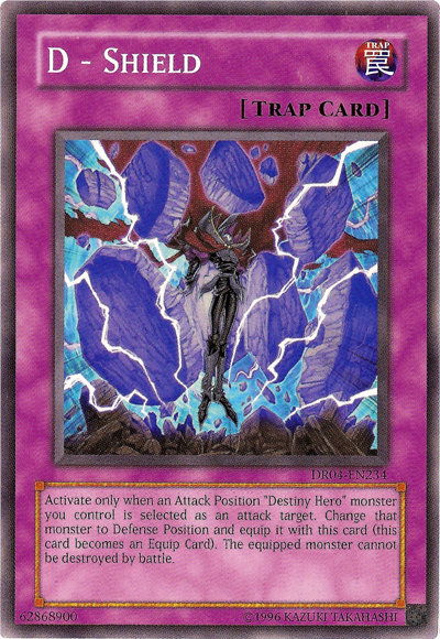 Activate only when an Attack Position "Destiny Hero" monster you control is selected as an attack target. Change that monster to Defense Position and equip it with this card (this card becomes an Equip Card). The equipped monster cannot be destroyed by battle.