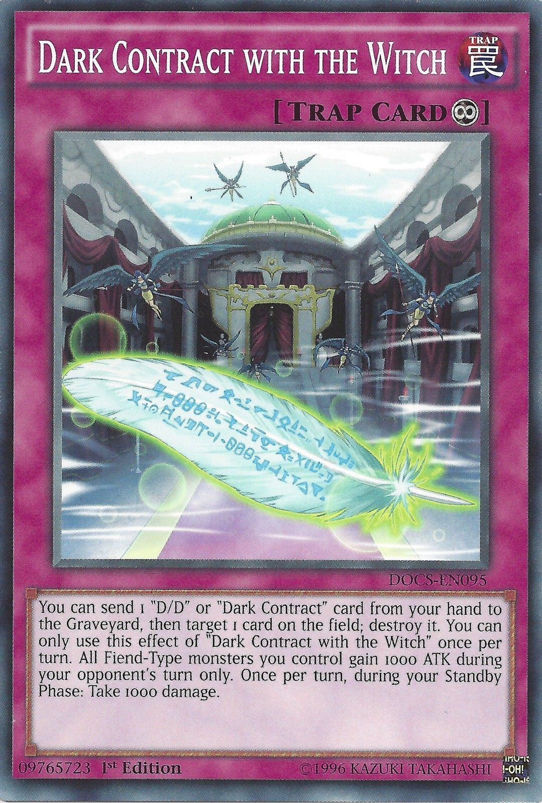 You can send 1 "D/D" or "Dark Contract" card from your hand to the Graveyard, then target 1 card on the field; destroy it. You can only use this effect of "Dark Contract with the Witch" once per turn. All Fiend-Type monsters you control gain 1000 ATK during your opponent's turn only. Once per turn, during your Standby Phase: Take 1000 damage.