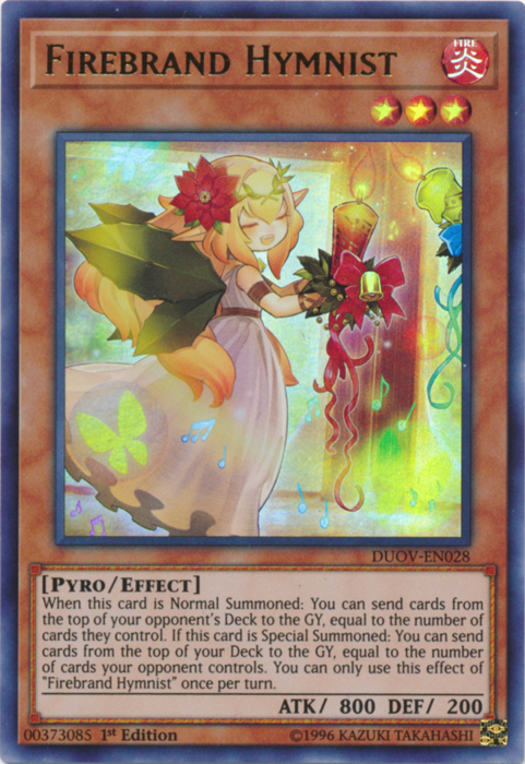 When this card is Normal Summoned: You can send cards from the top of your opponent's Deck to the GY, equal to the number of cards they control. If this card is Special Summoned: You can send cards from the top of your Deck to the GY, equal to the number of cards your opponent controls. You can only use this effect of "Firebrand Hymnist" once per turn.
