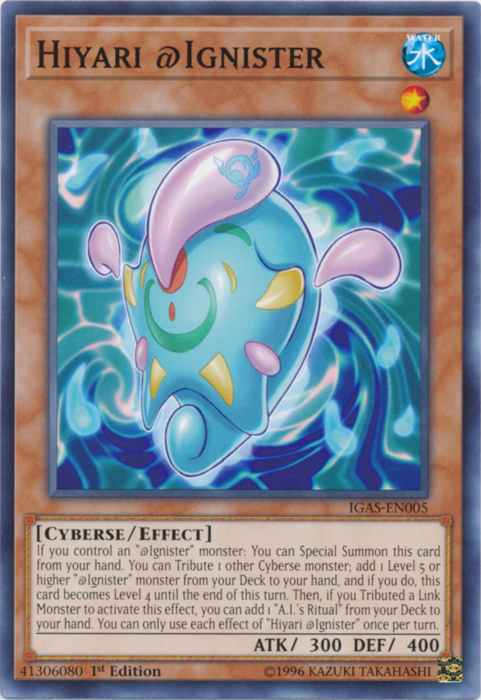If you control an "@Ignister" monster: You can Special Summon this card from your hand. You can Tribute 1 other Cyberse monster; add 1 Level 5 or higher "@Ignister" monster from your Deck to your hand, and if you do, this card becomes Level 4 until the end of this turn. Then, if you Tributed a Link Monster to activate this effect, you can add 1 "A.I.'s Ritual" from your Deck to your hand. You can only use each effect of "Hiyari @Ignister" once per turn.