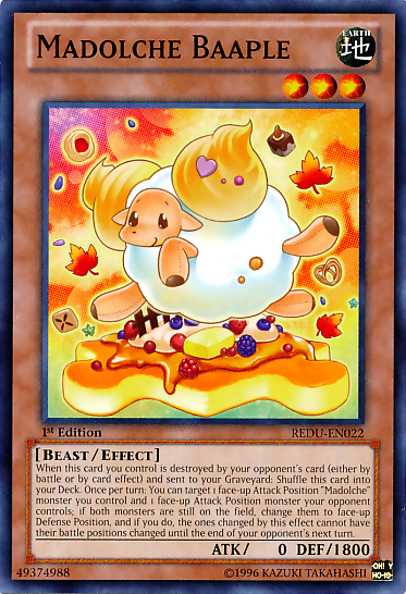 When this card you control is destroyed by your opponent's card (either by battle or by card effect) and sent to your Graveyard: Shuffle this card into your Deck. Once per turn: You can target 1 face-up Attack Position "Madolche" monster your control and 1 face-up Attack Position monster your opponent controls, if both monsters are still on the field, change them to face-up Defense Position, and if you do, the ones changed by this effect cannot have their battle positions changed until the end of your opponent's next turn.