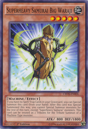 If you have no Spell/Trap Cards in your Graveyard, you can Special Summon this card (from your hand). After this card was Special Summoned this way, you cannot Special Summon monsters for the rest of this turn, except "Superheavy Samurai" monsters. This card can be treated as 2 Tributes for the Tribute Summon of a Machine-Type monster.